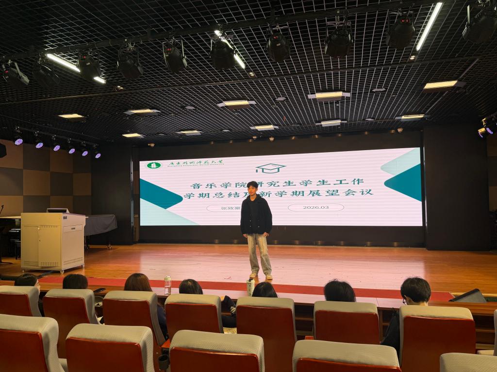 围绕学校关于“十五五”开局之年的奋斗目标,精准把握学校发展的时与势、谋与位、责与为,进一步提升音乐学院研究生学生工作实效。3月5日,音乐学院组织召开了研究生学生工作学期总结暨新学期展望会议。会议由研究生辅导员张致豪主持,全体研究生班干部参会。