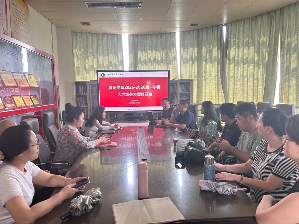 为积极响应学校深化本科教育教学改革的号召,深入推进人工智能技术与教育教学的深度融合,切实提升人才培养质量,2025 年 9 月 5 日,音乐学院召开了人才培养方案修订专题会议。学院领导班子成员、各系部主任、骨干教师以及教务员齐聚一堂,共同为学院人才培养的优化升级出谋划策。