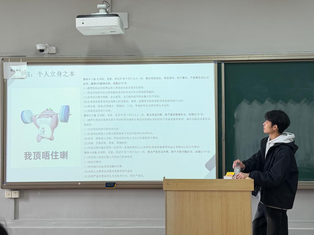 班会上,张致豪老师系统阐释了诚信在学术研究中的核心价值。他详细解读了《广东技术师范大学学生管理规定》中关于考试违纪和学术不端行为的具体条款,包括第四十二条规定的考试违纪行为、第四十三条规定的考试作弊行为以及第四十四条规定的严重考试作弊行为。他强调,任何违反学术诚信的行为都将受到相应处分,希望同学们引以为戒。