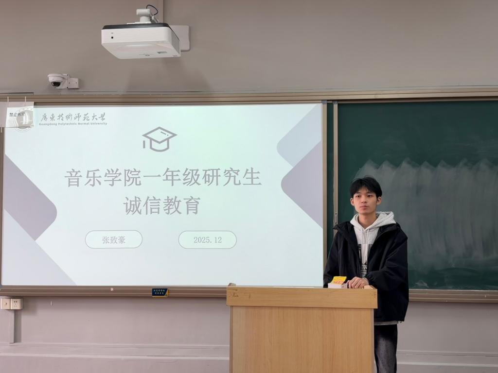 诚信是中华民族的传统美德,也是社会主义核心价值观的重要内容,更是大学生立身为人、成长成才的必备品质。12月1日,音乐学院在第二教学楼505教室举行一场“诚信应考,不负韶华”的主题班会。本次班会由音乐学院研究生辅导员张致豪主持,面向2025级学科教学(音乐)全体研究生。
