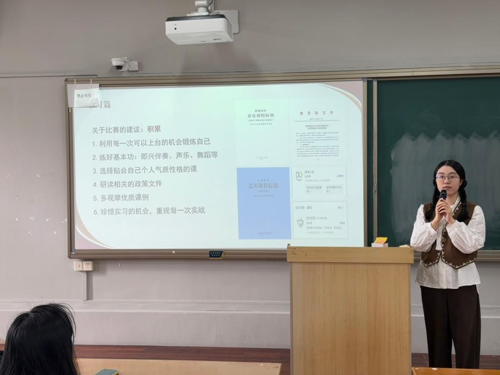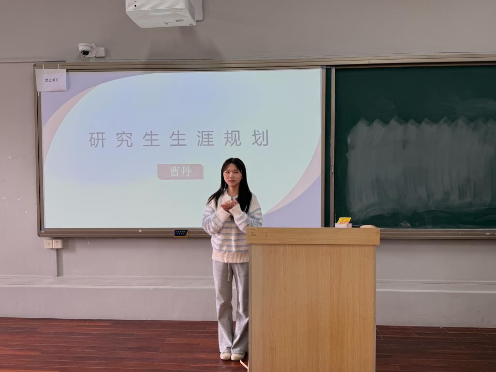 曹丹同学以“研究生生涯规划”为主题,从职业认知和岗位胜任力两方面分享。她结合国家政策,分析教育领域“五育并举”与数字化转型趋势,解读艺术课程标准新要求。随后,她以自己在教学技能大赛、创新竞赛获奖经历展开,建议同学们关注行业动态,通过比赛和实习夯实专业基础。