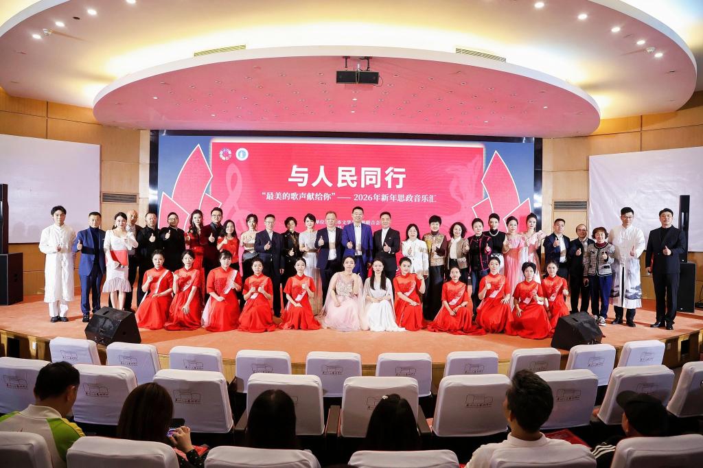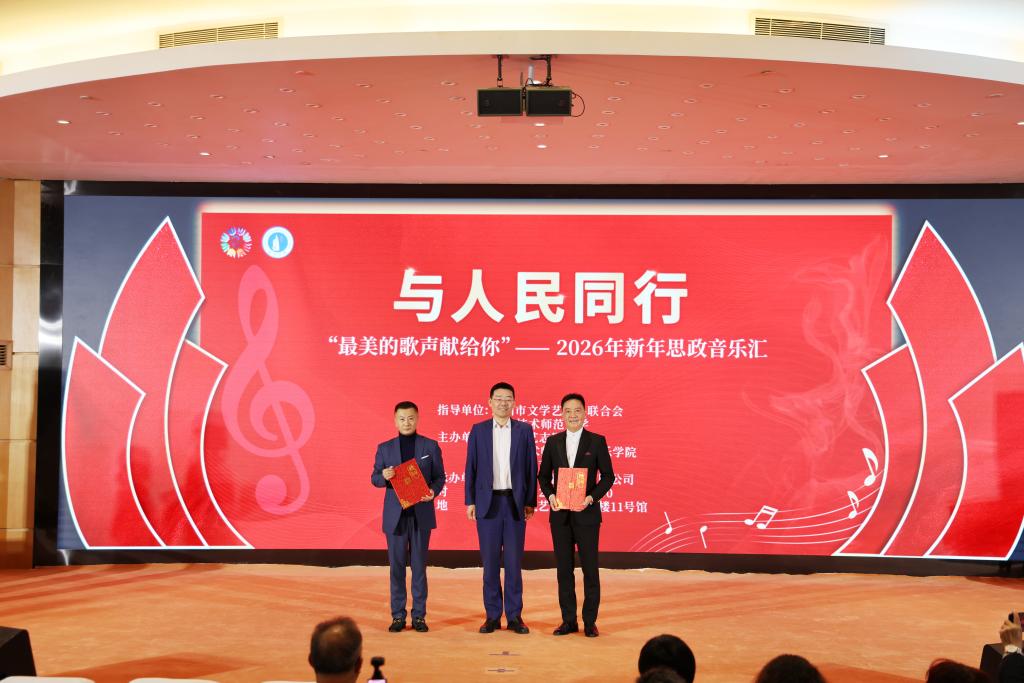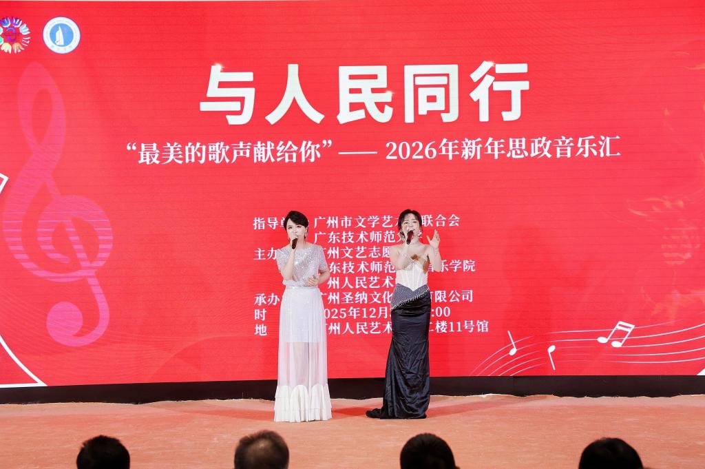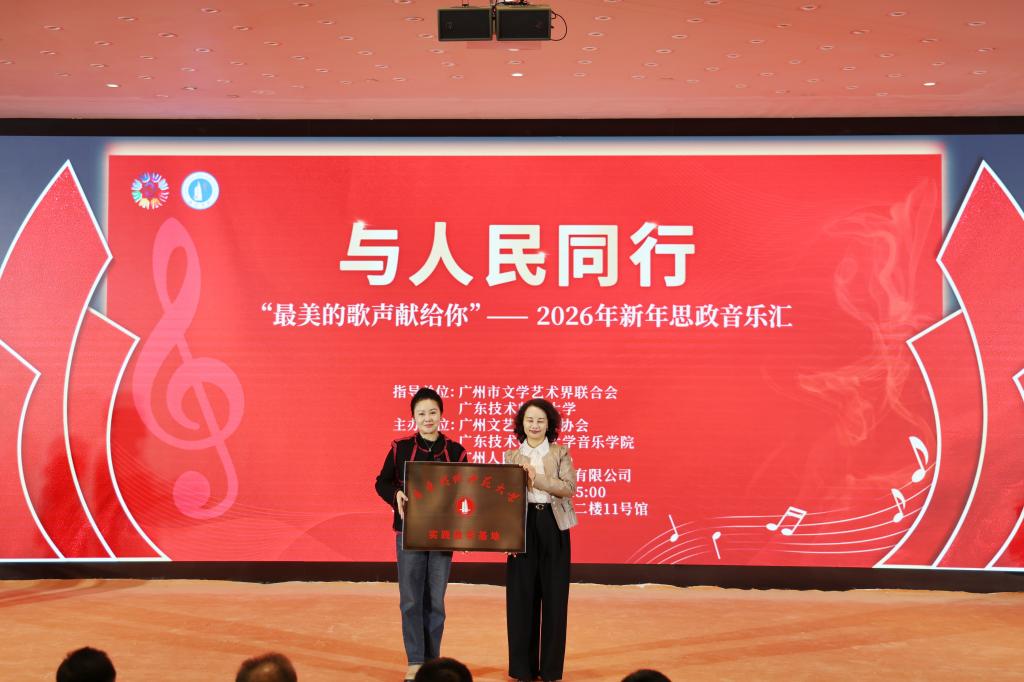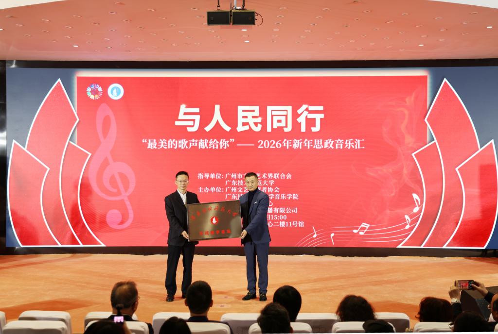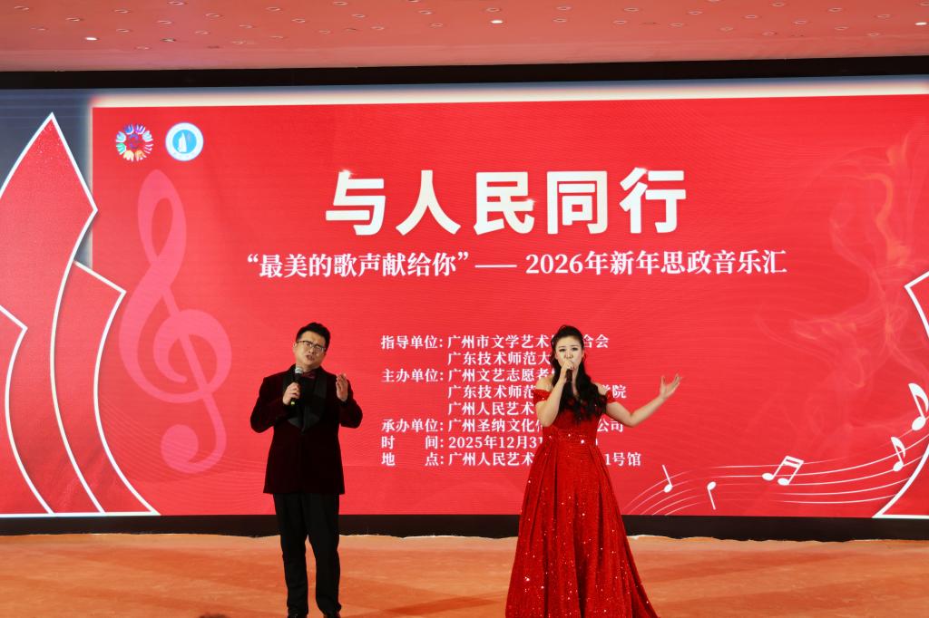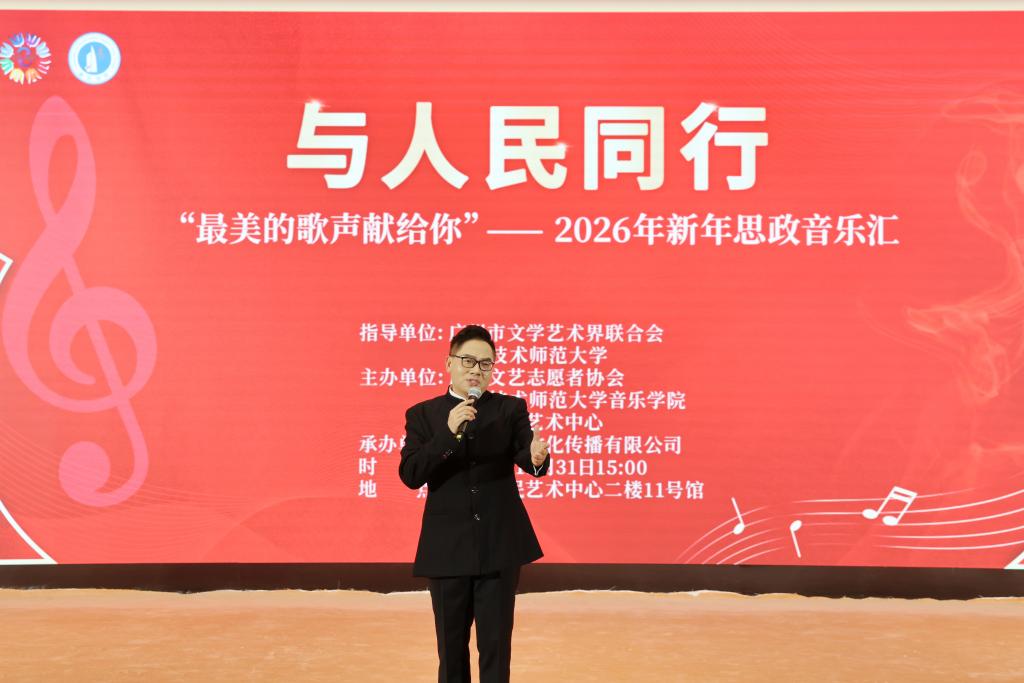 12月31日下午,由广州市文学艺术界联合会、广东技术师范大学指导,广州文艺志愿者协会、广州人民艺术中心、广东技术师范大学音乐学院联合主办,广州圣纳文化传播有限公司承办的 “与人民同行 ——‘最美的歌声献给你’2026年新年思政音乐汇”,在广州人民艺术中心多功能厅圆满举行。我校党委书记王兵,广州市文联党组成员、专职副主席皮健,广州文艺志愿者协会主席钟晖等相关单位领导,艺术家代表唐彪及音乐学院师生代表共同参与这场思政与艺术交融的文化盛宴。