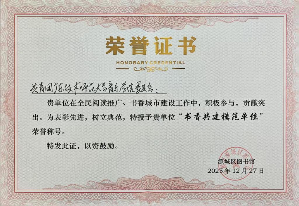 近日,由源城区文化广电旅游体育局主办、源城区图书馆承办的“十年深耕·书香筑梦”新馆开馆十周年阅读推广成果展示活动,在源城区图书馆四楼报告厅圆满举行。活动上,音乐学院团委被授予“书香共建模范单位”称号,标志着学院在服务地方文化建设、深化校地共建方面取得扎实成效。