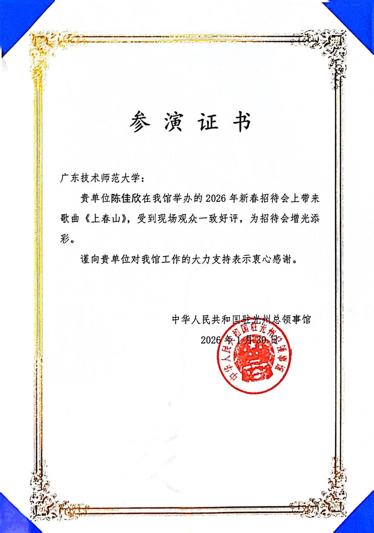 应总领事馆邀请,我校音乐学院声乐青年教师陈佳欣受邀出席本次新春招待会,并在文艺展演环节担任嘉宾。演出中,陈佳欣老师凭借扎实的声乐专业功底、饱满的情感表达,倾情演绎歌曲《上春山》,以悠扬歌声传递新春祝福,用艺术之力凝聚情感。精彩的表演赢得现场全体嘉宾的热烈掌声,为招待会增添了浓厚的节日氛围。