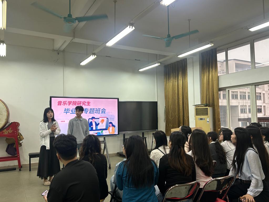 3月30日,音乐学院在二教605召开2023级硕士研究生毕业生专题班会。副院长邓昆、研究生辅导员张致豪、研究生工作秘书连珏出席会议并讲话,全体2023级学科教学(音乐)硕士研究生参加本次会议。